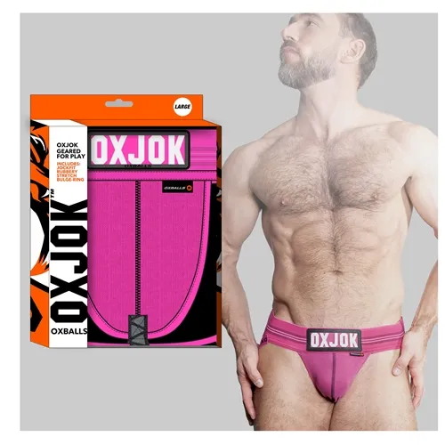 Bold 3-D rubber OXJOK on center-front plus OXBALLS pouch tag and rearview top-of-the-buttcrack OX logo are all designed to show you off front or back. Includes our rubbery JOKFIT cock ring and discrete BUNGEE cock ring lifter inside the pouch that pulls up your junk when you want more bulge.