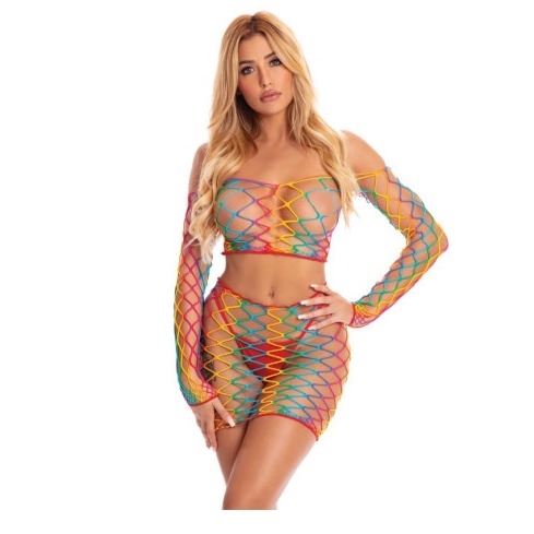 Pot of Gold is a 2pc set made of fishnet fabric in bright rainbow colours with large openings.