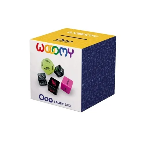 Die 1 with 6 naughty actions (kissing, sucking, etc.), die 2 with 6 body parts (neck, ears, etc.), die 3 with 6 geographical locations (garden, car, etc.), die 4 with 6 different sexual positions, 5 dice with 12 different sexual positions