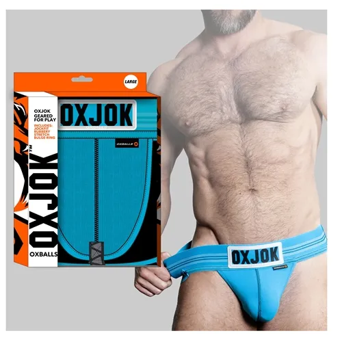 Bold 3-D rubber OXJOK on center-front plus OXBALLS pouch tag and rearview top-of-the-buttcrack OX logo are all designed to show you off front or back. Includes our rubbery JOKFIT cock ring and discrete BUNGEE cock ring lifter inside the pouch that pulls up your junk when you want more bulge.